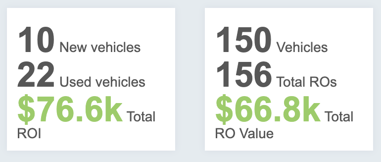 LEFT: You will find a breakdown of New Vehicles vs Used Vehicles as well as total ROI as shared by the Dealer Management System and mapped fields.