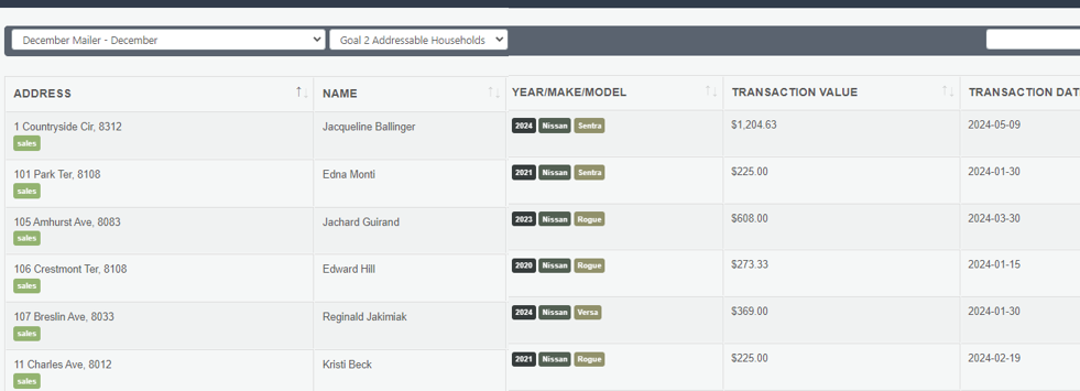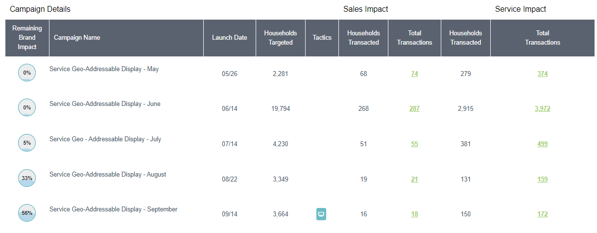 This report would populate in a situation when a client brings a list of their own household customers to target. Upon a marketing campaign being run to that unique audience, Custom Activations would check the households against transactions (in this example - Sales & Service) to see how the campaign performed, matching campaign audience members to sales.