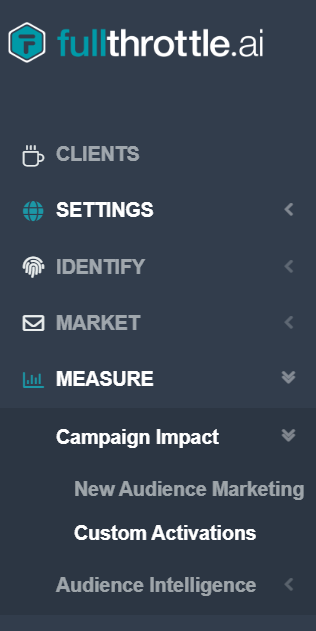 The Custom Activations screen reports incremental lift from segmented campaigns being served to custom audiences. These are campaigns that are separate from marketing running through fullthrottle.app products and programs.