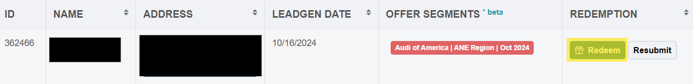 • Search for your customer using their name or email address in the top right column search bar. When you find the customer, you can select Resubmit. (clicking Redeem will allow you to redeem their coupon code)