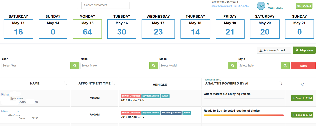 These appointments come through the dealer's DMS feed and allow users to view customers who will be in the service center, paired with learned behaviors from their engagement in the Previous Customers platform / marketing efforts.