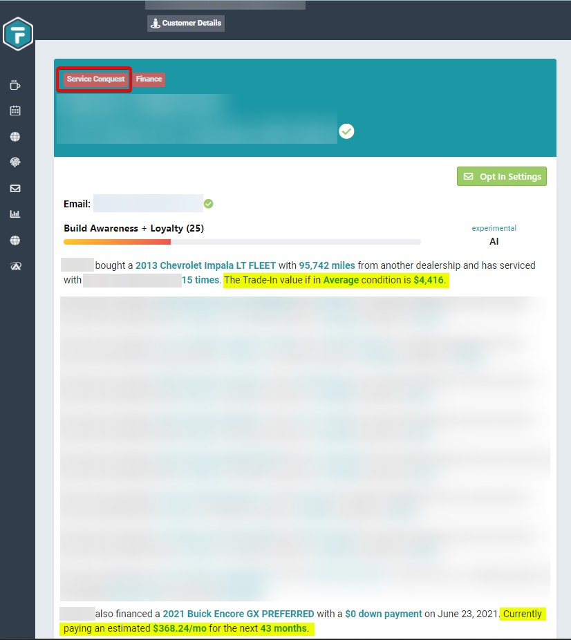 The trade-in value shows only on profiles that are within the Service Conquest Segment and the vehicle has a value greater than 0 associated with their pay-off amount, valid VIN & estimated miles.