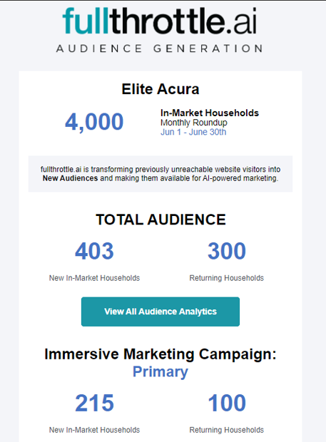 A comprehensive recap, summarizing the previous months activity, household totals, matched marketing efforts if applicable, and more. Delivered monthly.